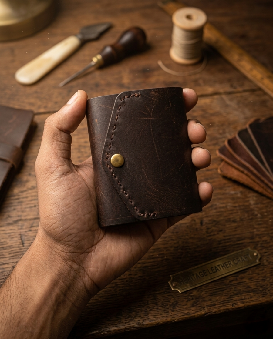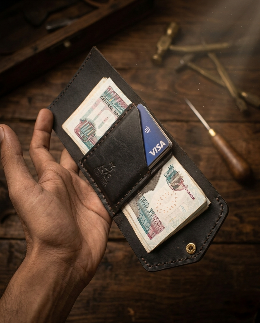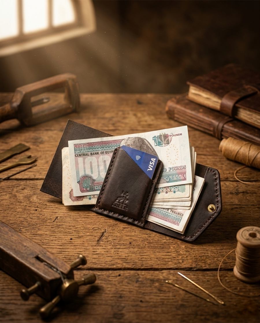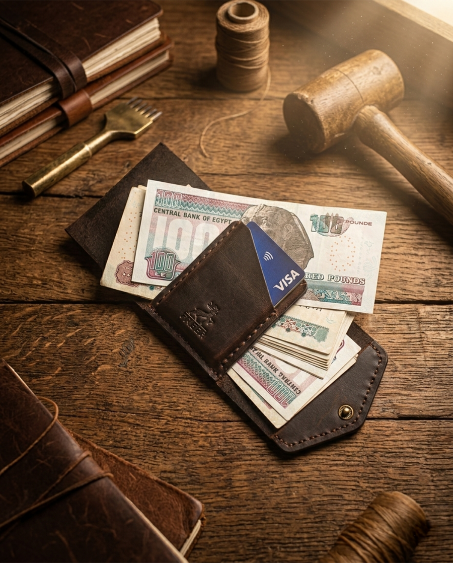 المحفظة مصنوعة يدويًا من جلد طبيعي أصلي مشحم، بجودة عالية تتحمل الاستخدام اليومي وتعيش معاك سنين طويلة. احصل على محفظتك الأنيقة اليوم!