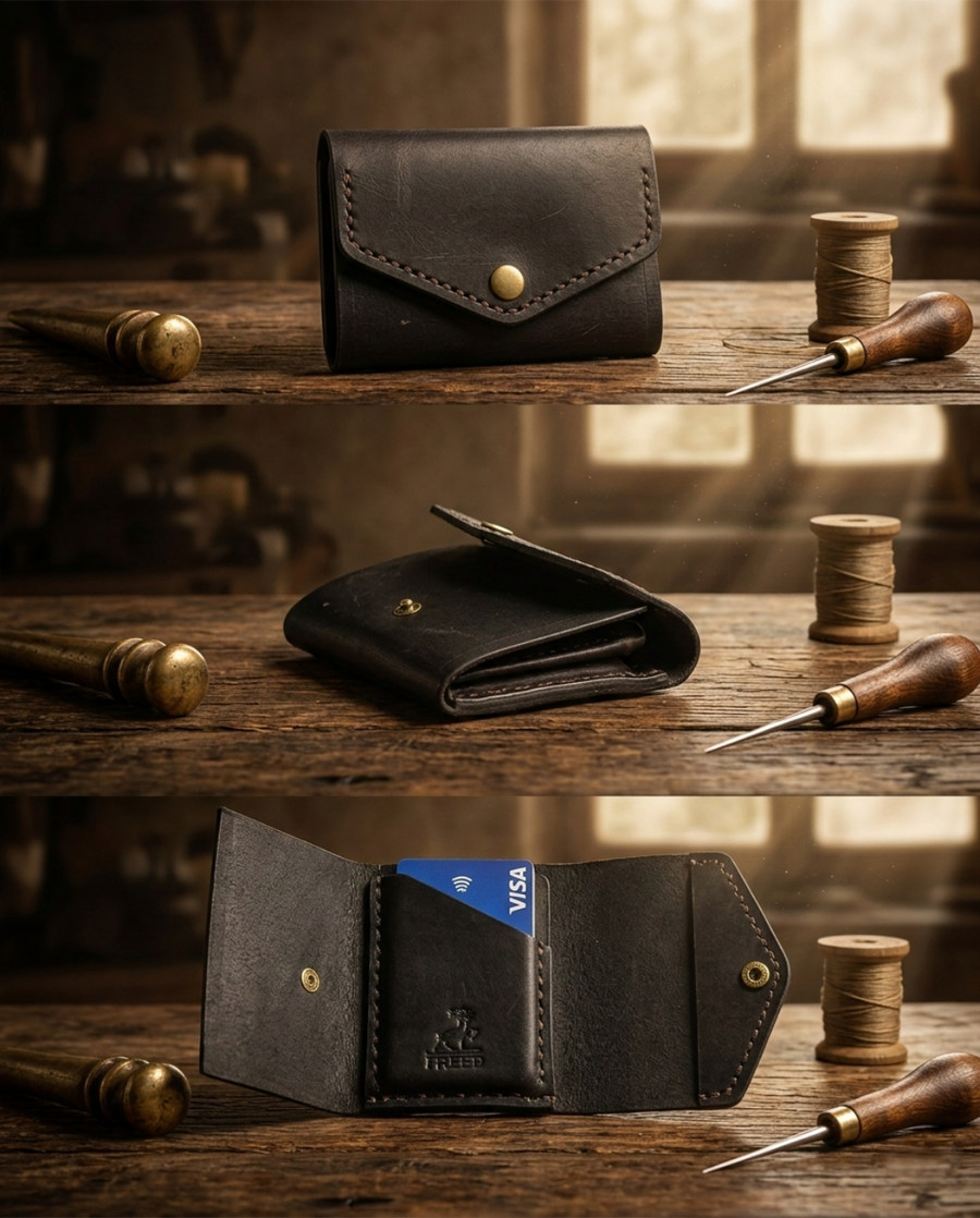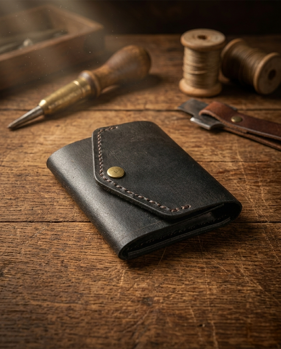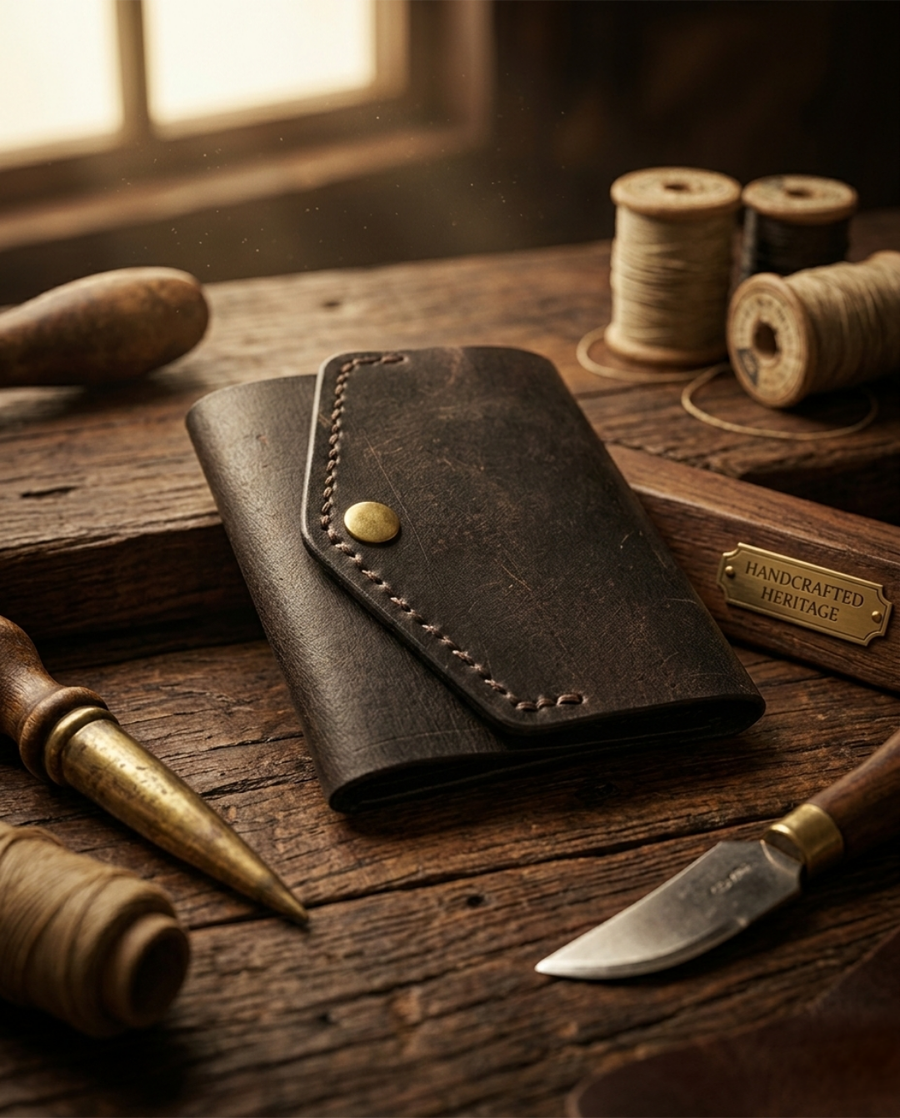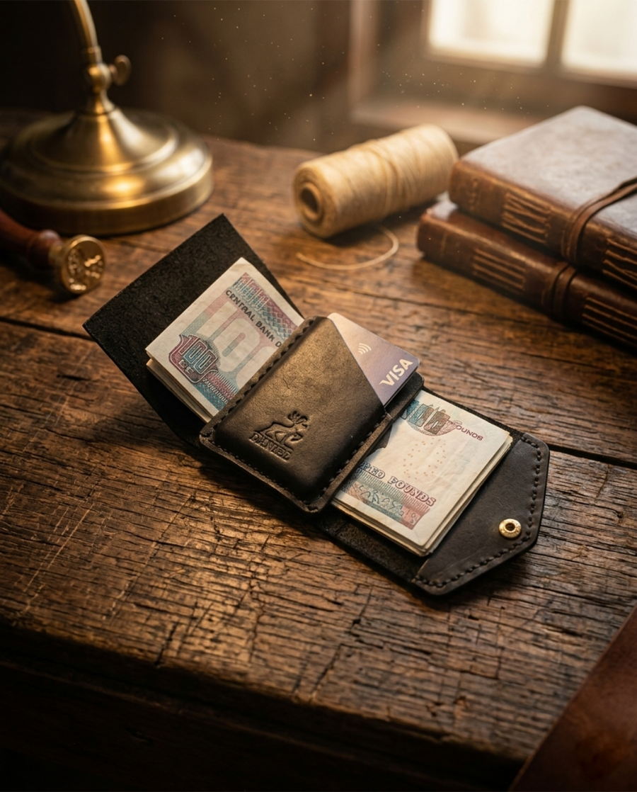 المحفظة مصنوعة يدويًا من جلد طبيعي أصلي مشحم، بجودة عالية تتحمل الاستخدام اليومي وتعيش معاك سنين طويلة. احصل على محفظتك الأنيقة اليوم!
